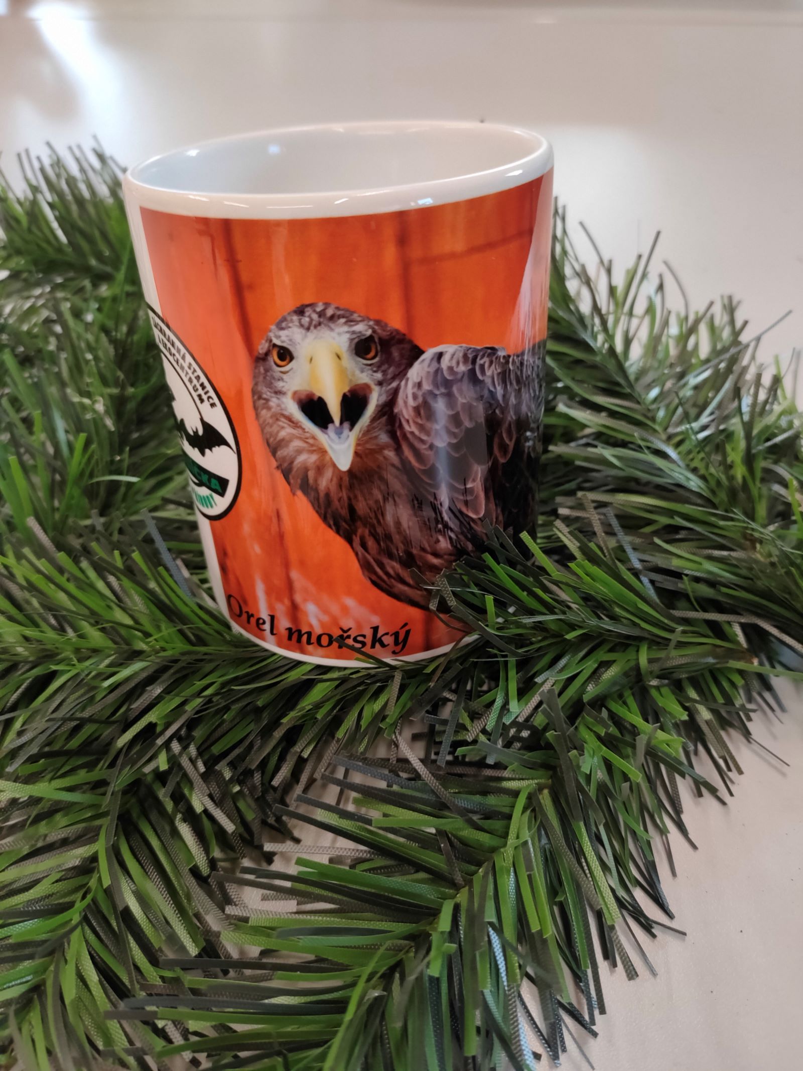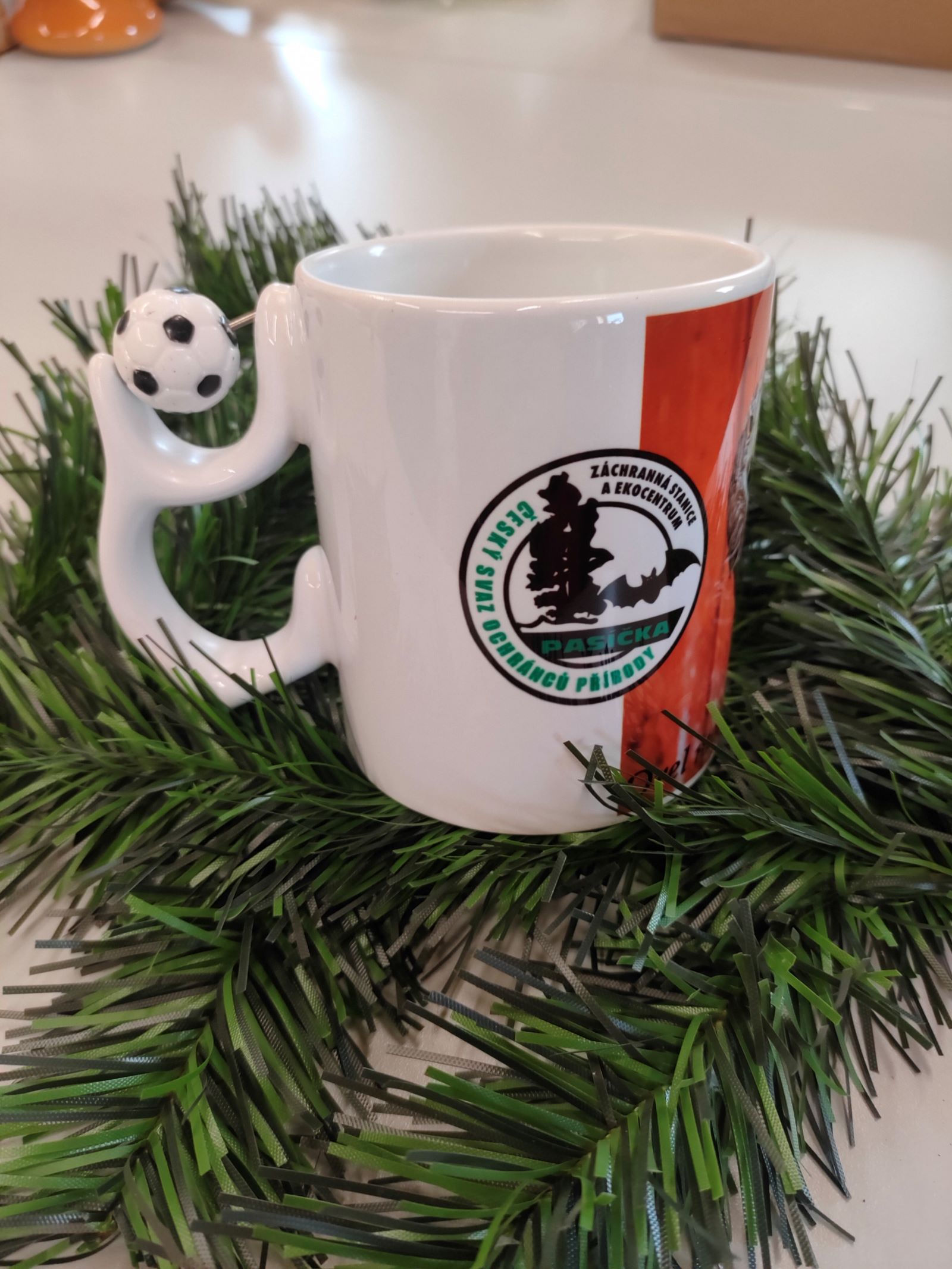 Hrnek s orlem říčním- ouško hrnečku je ozdobeno fotbalovým míčem.