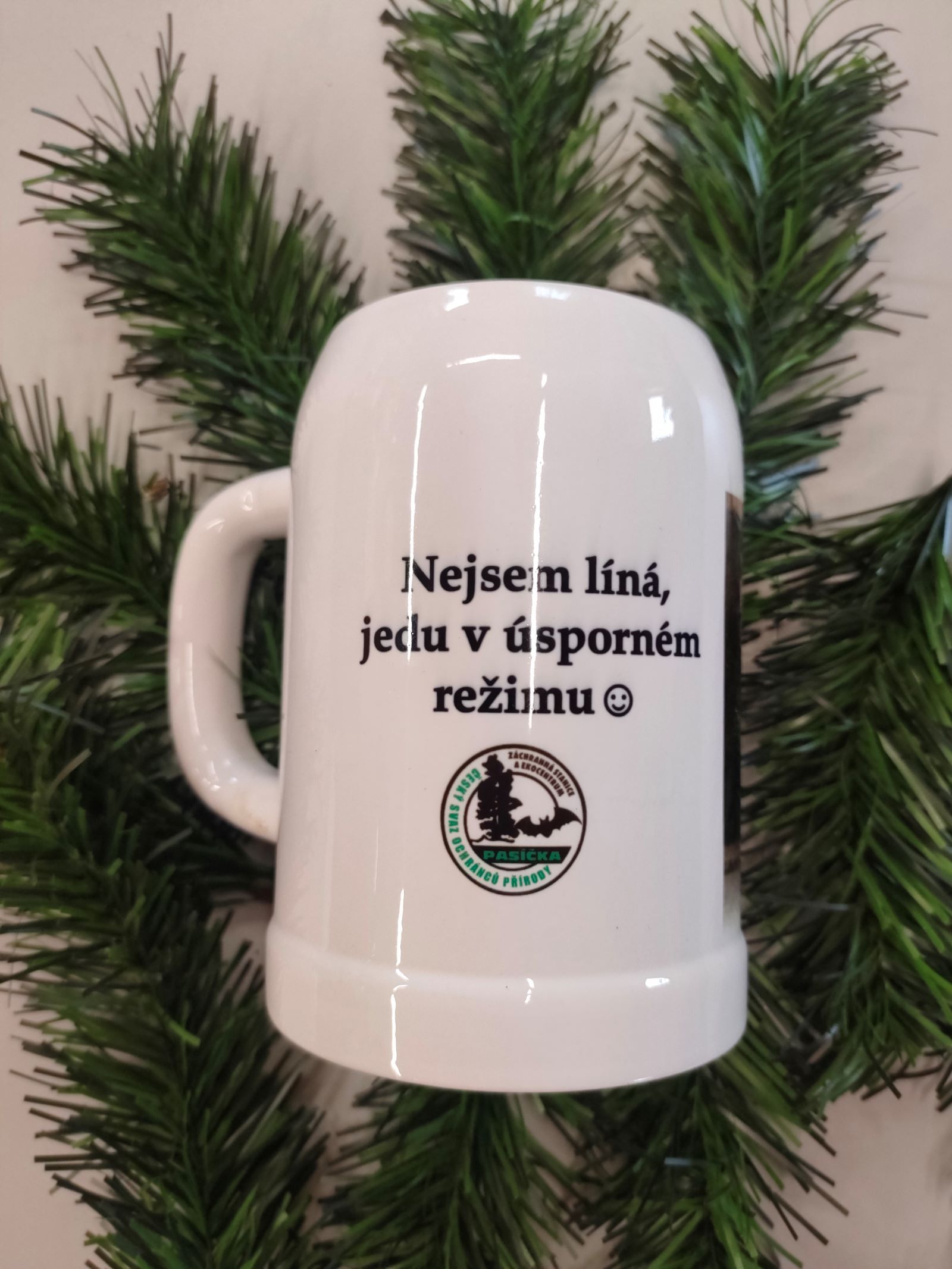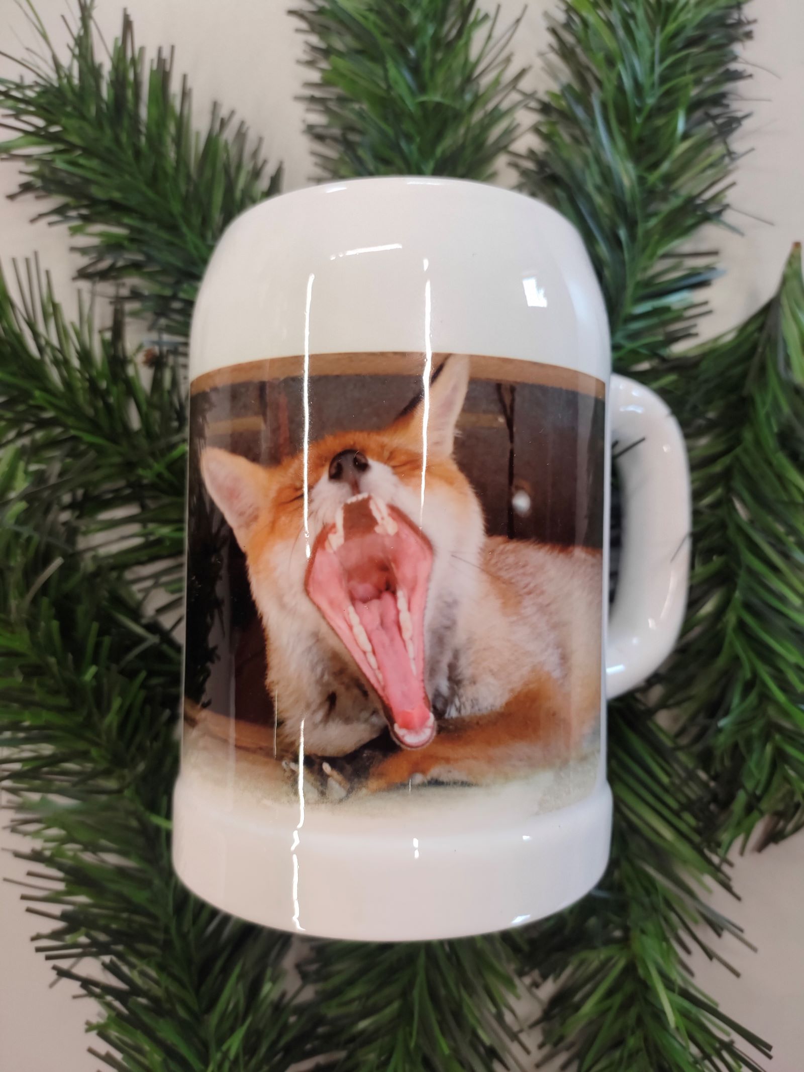 Keramický korbel nejen na pivo, 600 ml. se zívající - línou liškou obecnou a nápisem "Nejsem líná, jedu v úsporném režimu"