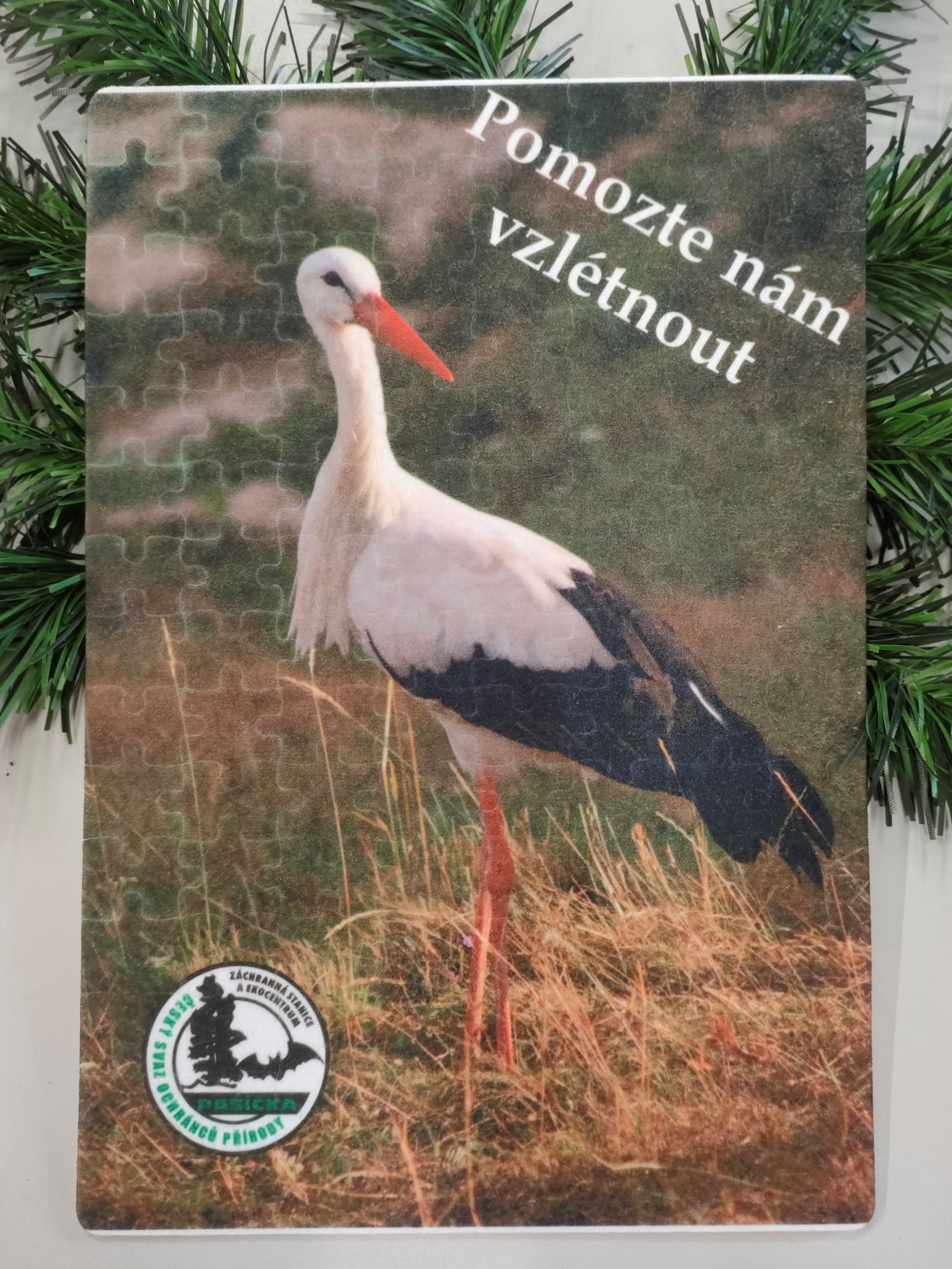 Potisk čápa bílého s nápis "Pomozte nám vzlétnout"