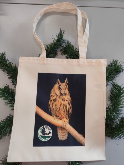 Plátěná taška s oboustranným potiskem sovy kalouse ušatého. Na jedné straně je ještě mládě a na straně druhé je již dospělí jedinec.
