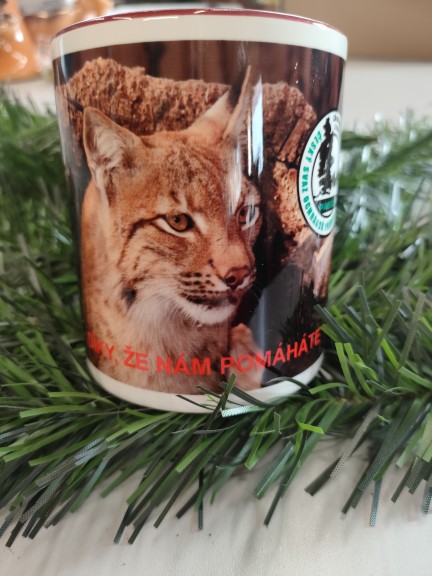 Vnitřek a ouško hrnečku je tmavě modré. Obrázek rysa ostrovida s nápisem "Díky, že nám pomáháte".