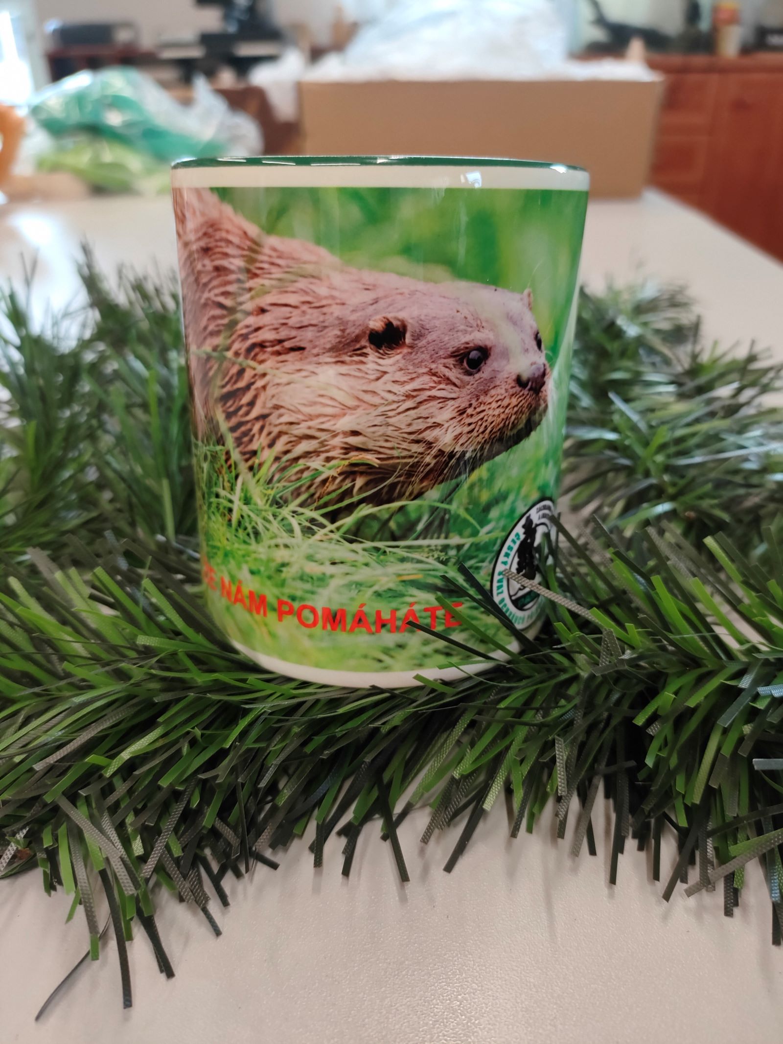 Vnitřek a ouško hrnečku je zelený s nápisem "Díky, že nám pomáháte".